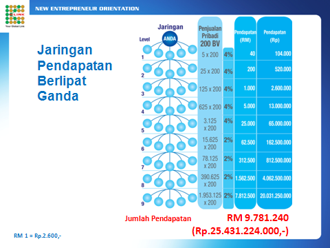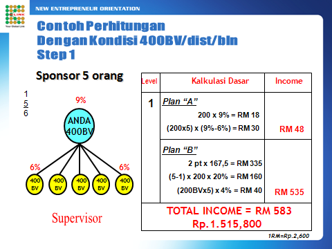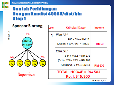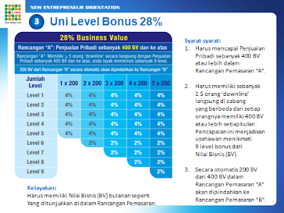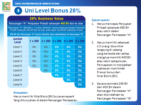 - Anda akan berbagi sebanyak 20% dari 200 BV penjualan 'downline' Anda yang kedua hingga kelima atau lebih. Cara ini akan mendorong ‘upline’ untuk menolong ‘downline’ mereka melakukan sponsoring.